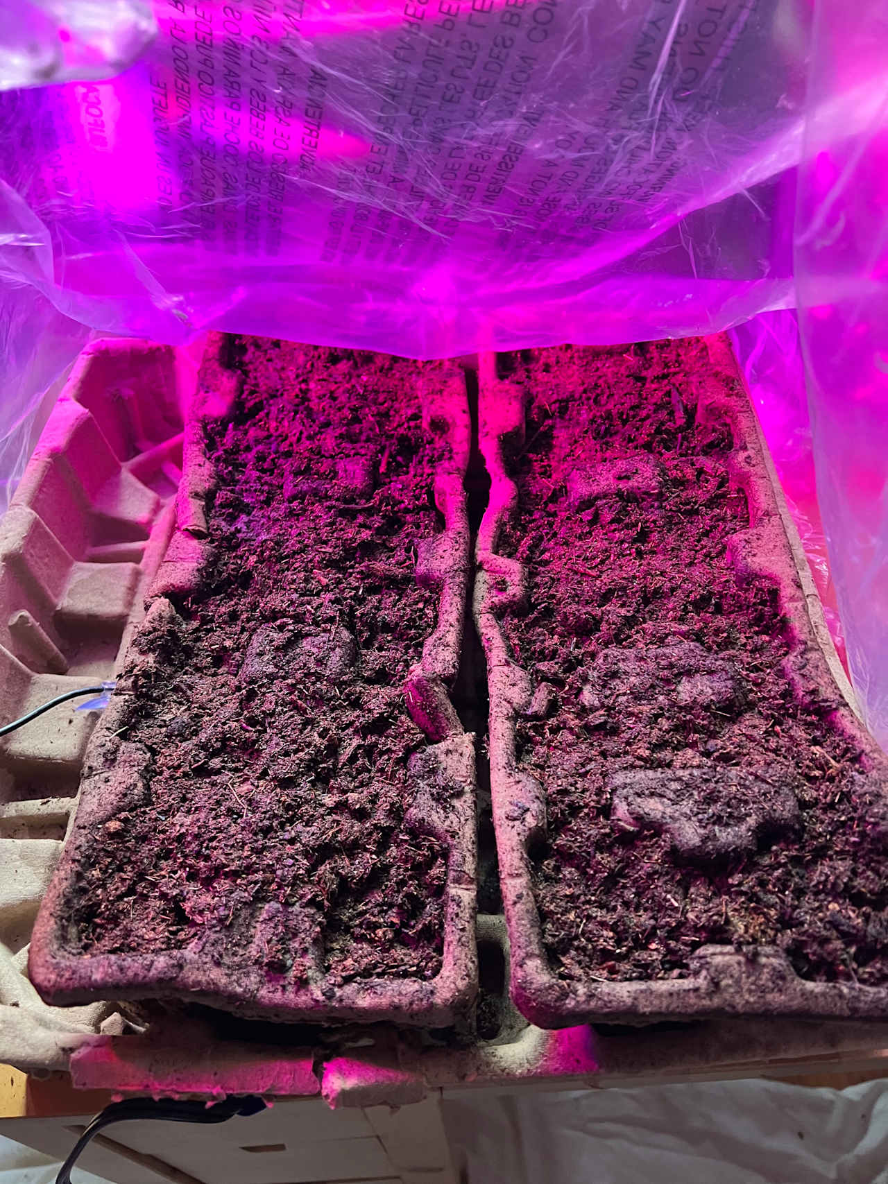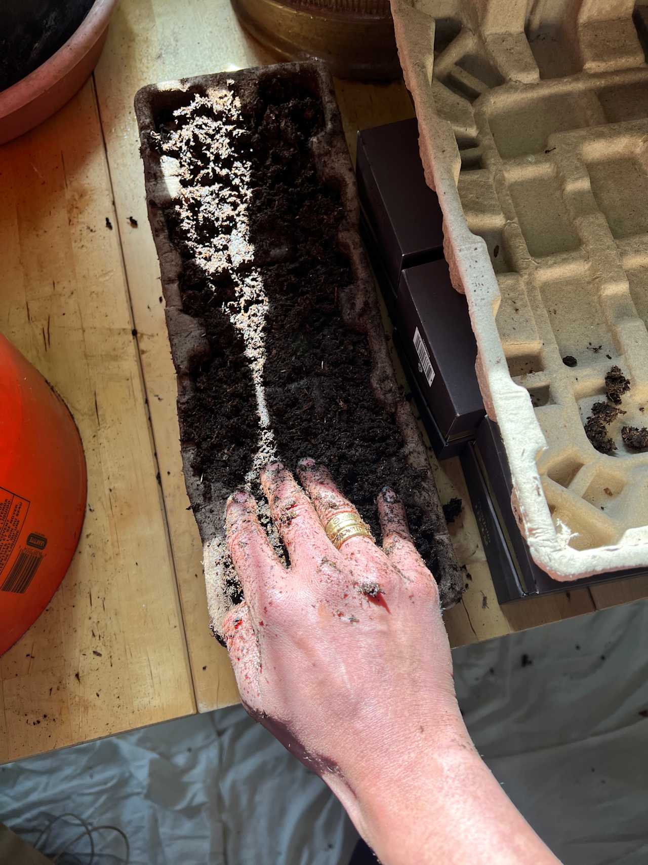 Using peat moss saved from Summer 2022, pack it tightly and wet it thoroughly into each planting cell, ensuring to pat it down to limit air pockets and to allow the medium to become fully dampened.